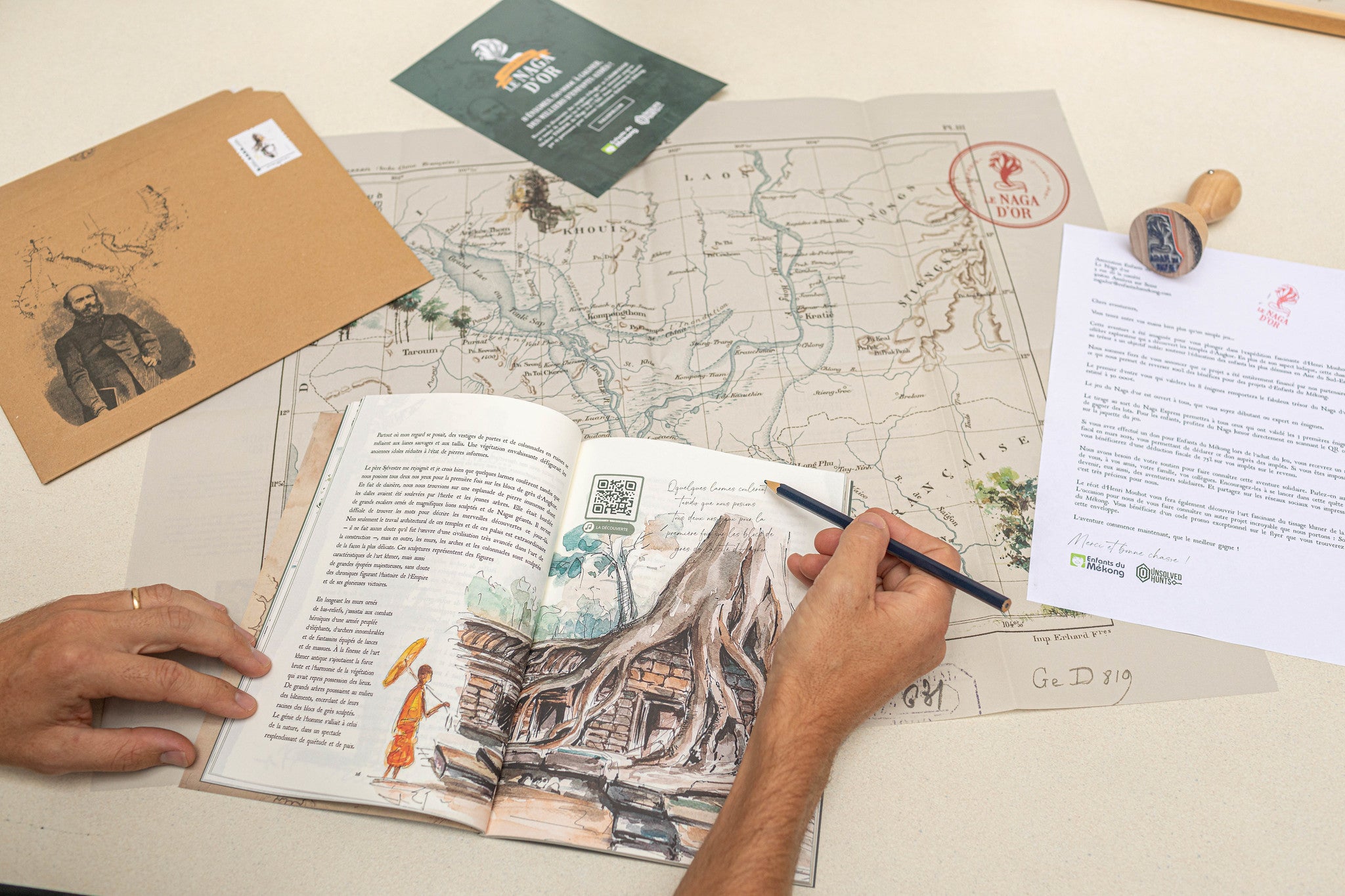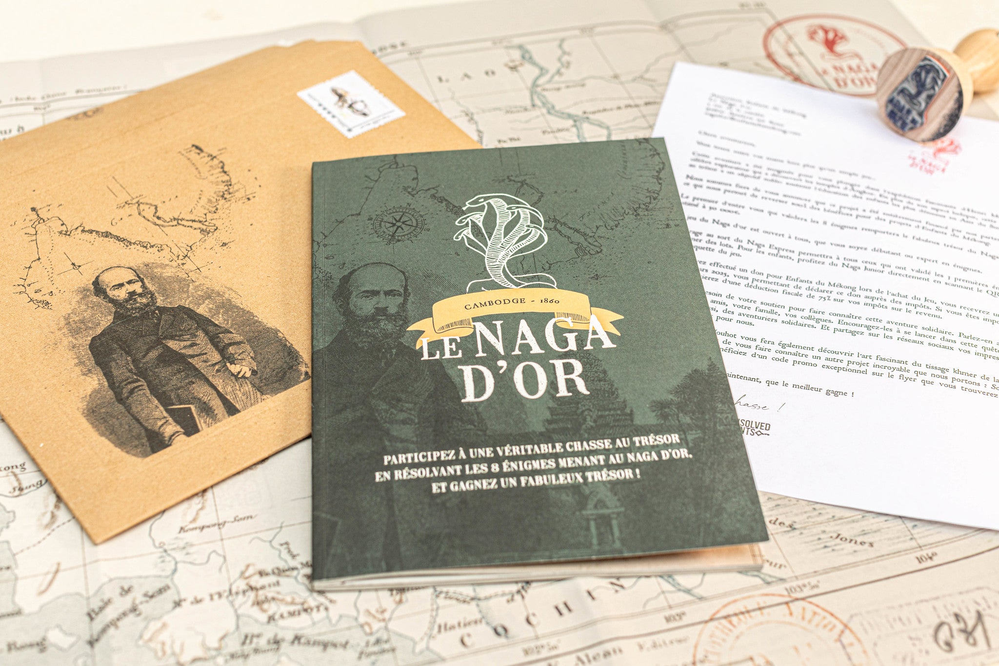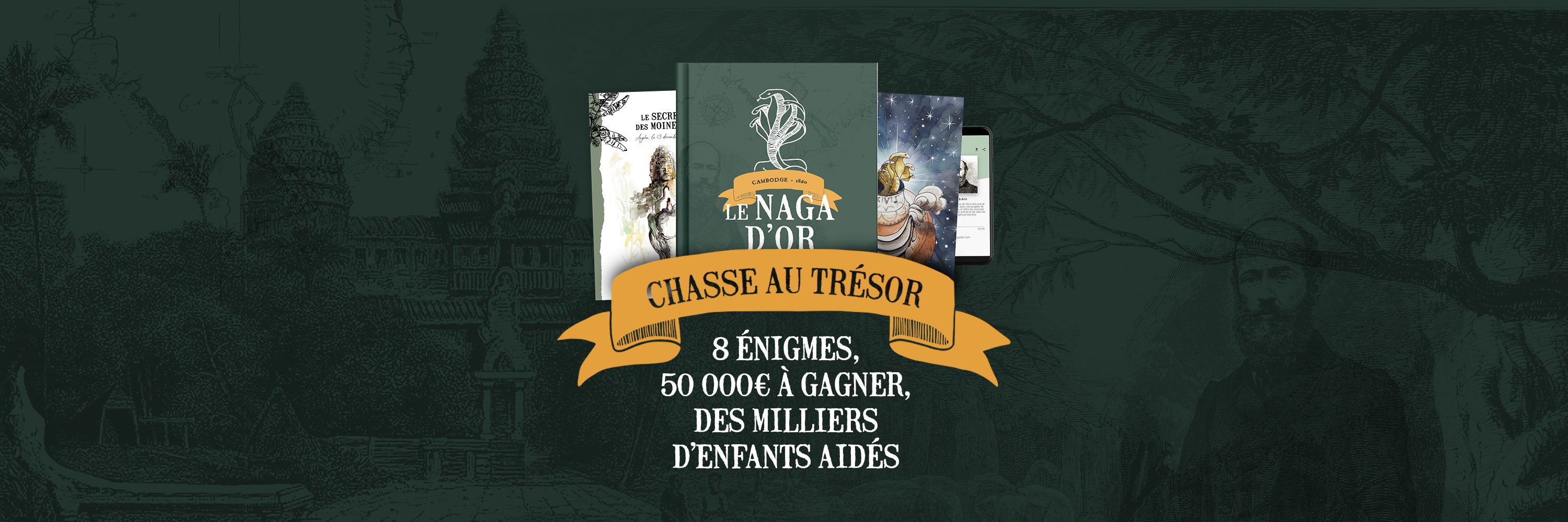 2024, Cambodge : Lors de la construction d’une école, un volontaire de l’association Enfants du Mékong retrouve intact le carnet secret d’Henri Mouhot. Son journal contient 8 énigmes menant au trésor caché. La chasse est lancée ! Depuis chez vous, résolvez les 8 énigmes et devenez le grand gagnant du Naga d’Or.