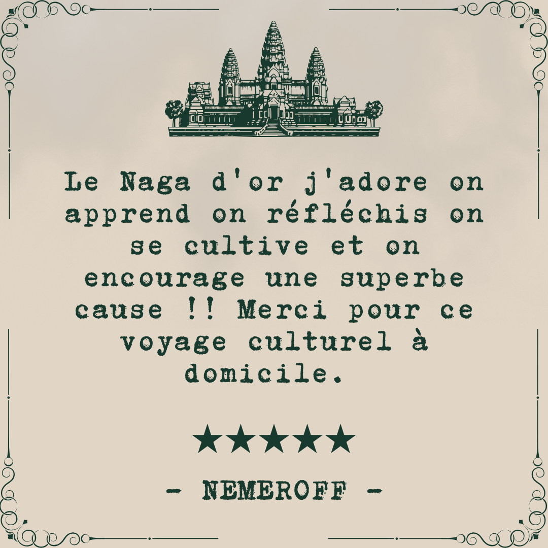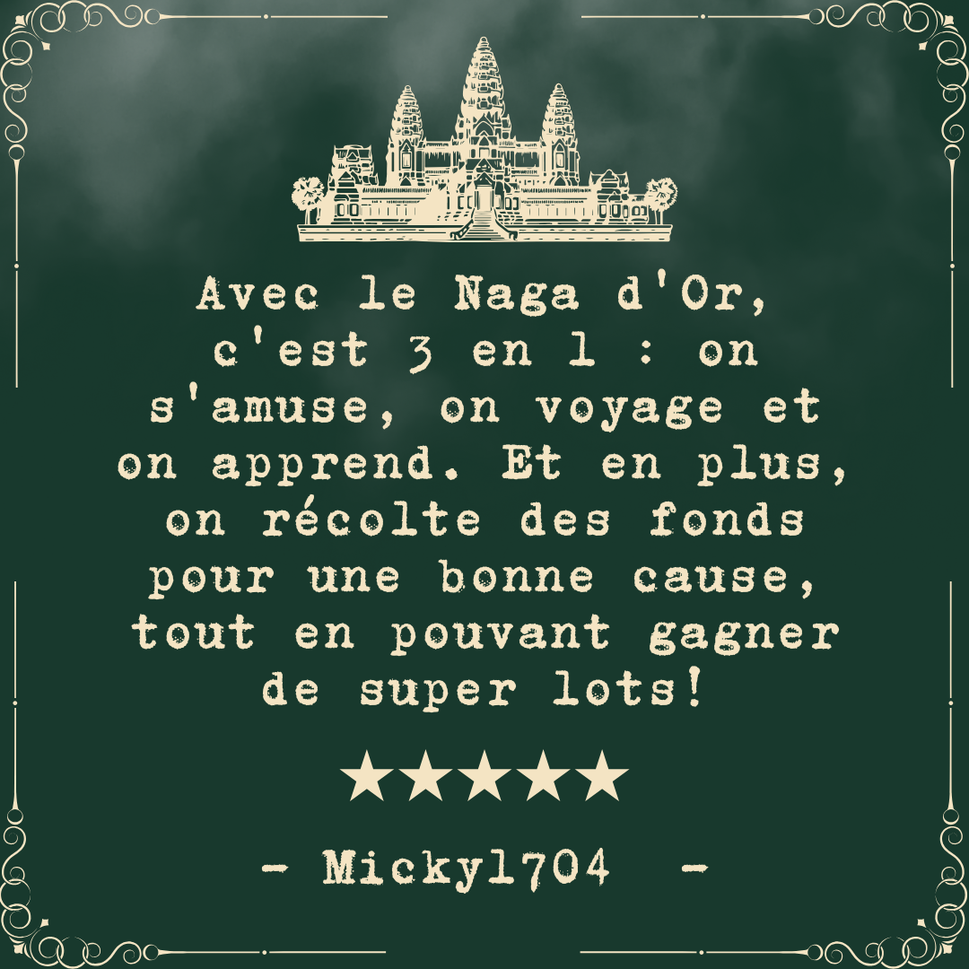 2024, Cambodge : Lors de la construction d’une école, un volontaire de l’association Enfants du Mékong retrouve intact le carnet secret d’Henri Mouhot. Son journal contient 8 énigmes menant au trésor caché. La chasse est lancée ! Depuis chez vous, résolvez les 8 énigmes et devenez le grand gagnant du Naga d’Or.