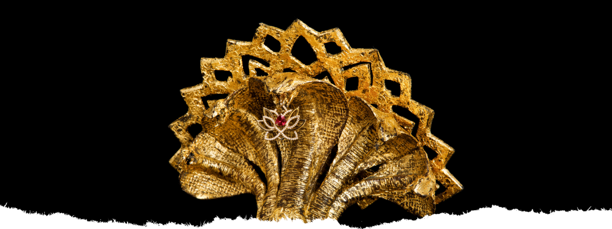 Le pendentif « lotus » en diamants et or jaune 18 carats est serti d’un magnifique rubis Siam. Il est réalisé par nos meilleurs artisans à Paris et peut se porter autour du cou ou être présenté dans la gueule du naga d’or sculpté avec talent par Anne-Laure de Chillaz.